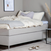 Sammantaget är sängen uppbyggd för att ge en skön sovkomfort samt ge ett enhetligt intryck i sin helklädda design. Hela sängen vilar på 12 cm höga champangeben i silvrig aluminium.