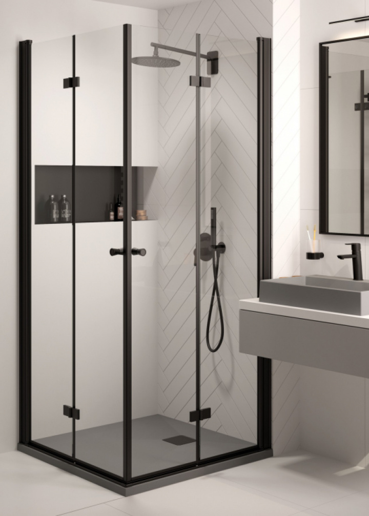 Vikbar duschdörr med svarta detaljer.